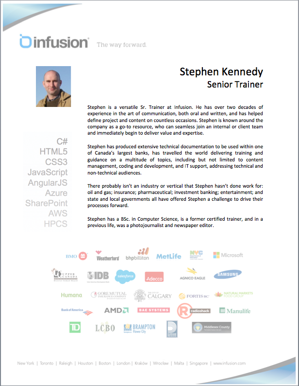 Between paid engagements, Infusion had me create and format employee and hiring candidate resumes into their internal template. I produced over 300 multi-page profiles (receiving a gift of my first and only bottle of scotch from an Infusion London UK manager who attributed my work to helping grow their office) and over 40 single-page bios. While profiles appeared as simply detailed resumes, bios were often used with RFPs to give the client a sense of the individuals being put forward to work on a project. I was given a fairly fixed profile template, but created the bio template myself, producing the body copy, adding a semi-transparent graphical list of clients the consultant has worked with, and often a fading list of technologies or skills in which the consultant was an expert.